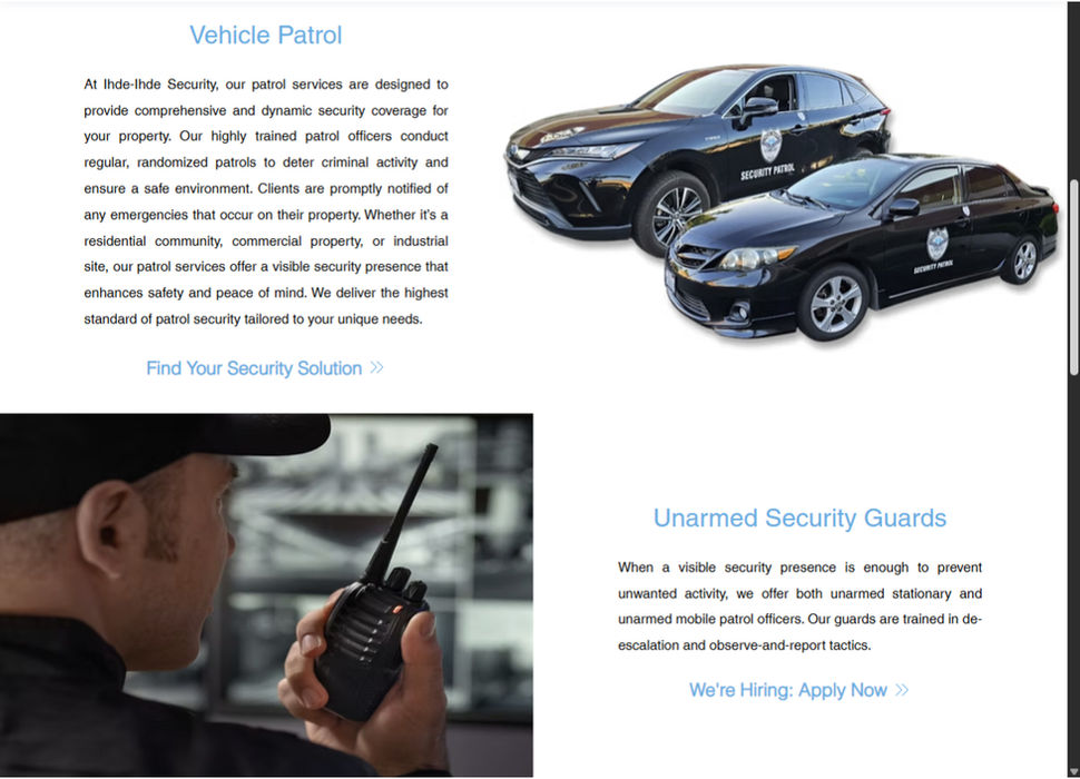 Built for Ihde-Ihde Security, a small local business, this site streamlines hiring with a custom employment application that feeds directly into the company's Customer Relationship Management (CRM) — offering a cost-effective alternative to Indeed. It also boosts lead generation by clearly highlighting core services (Vehicle Patrol, Standing Guards, Vacation Watch) and features user-friendly service request forms. Built for scalability, the site allows the Ihde-Ihde team to manage updates independently.